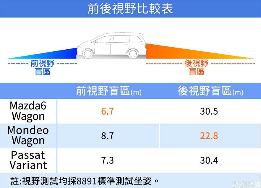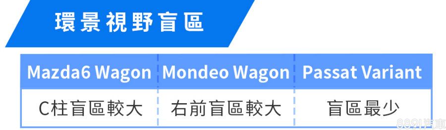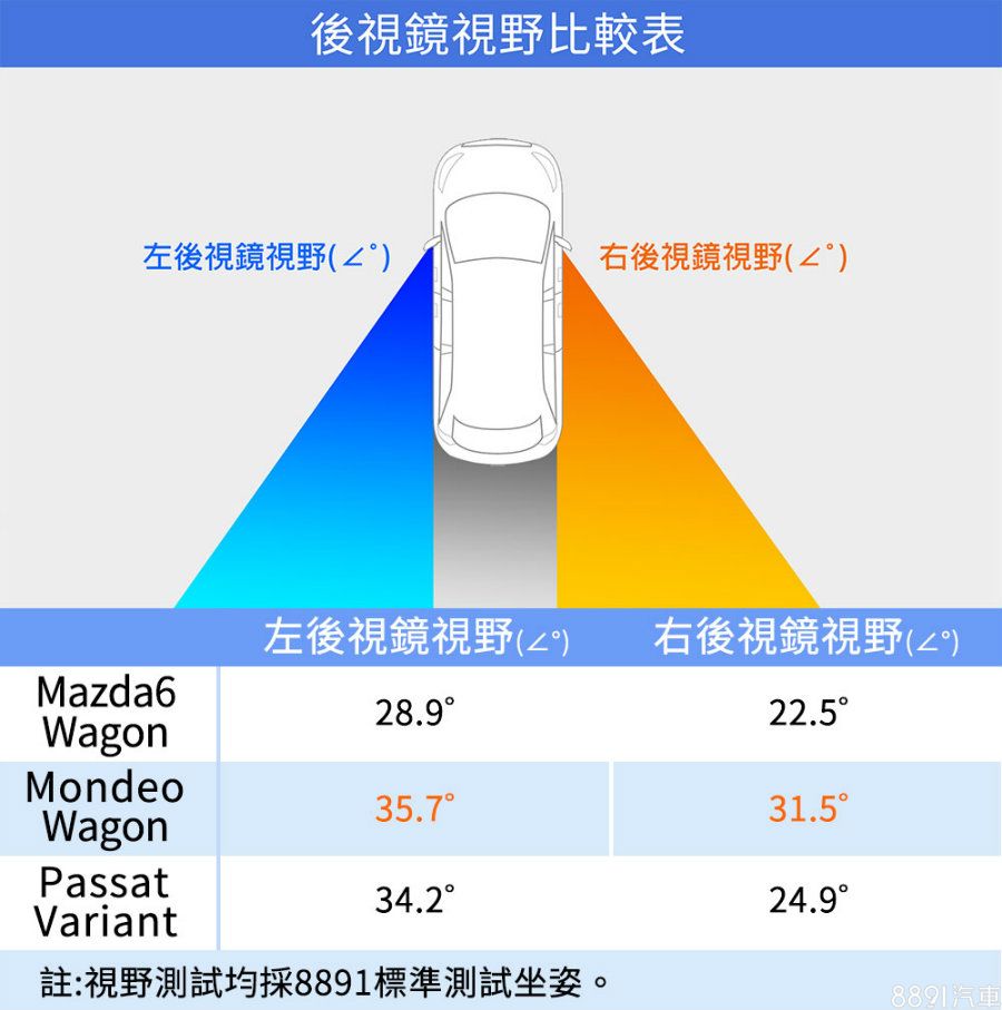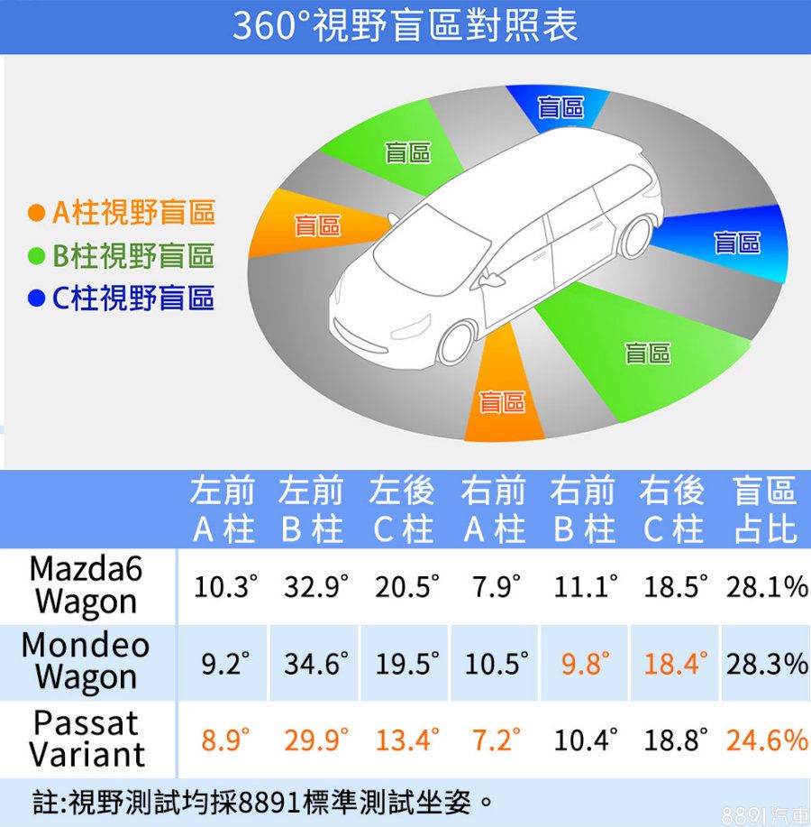 以實測角度來看,Passat擁有最少的視覺盲區,主因在於A、B柱設計較細,C柱三角窗區域也最方正,得以加大窗戶面積換取視野,對比Mazda6與Mondeo左後C柱盲區數據,便明顯小上不少。Mondeo總盲區較多,主因在於A柱內裝板件較厚,尤其在右前A部分視野影響最大,其餘數據與Mazda6差不多!