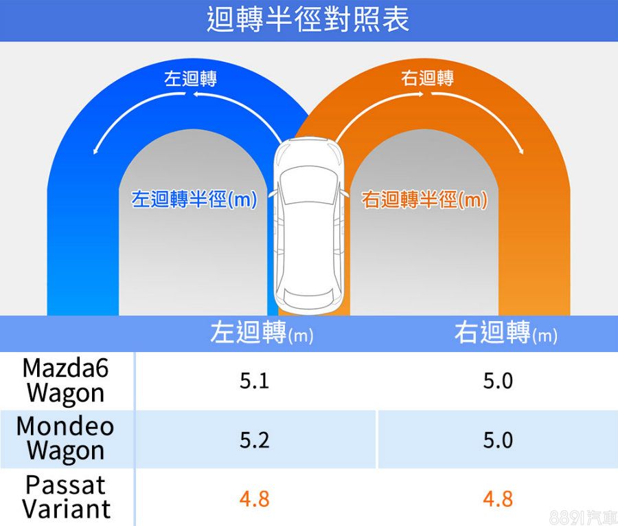 以軸距長度來看Mazda6最短,但同樣條件下測試,Passat的左、右4.8m反倒是最優異的!而Mondeo左右迴轉差距0.2m,為三車中差異最大者。
