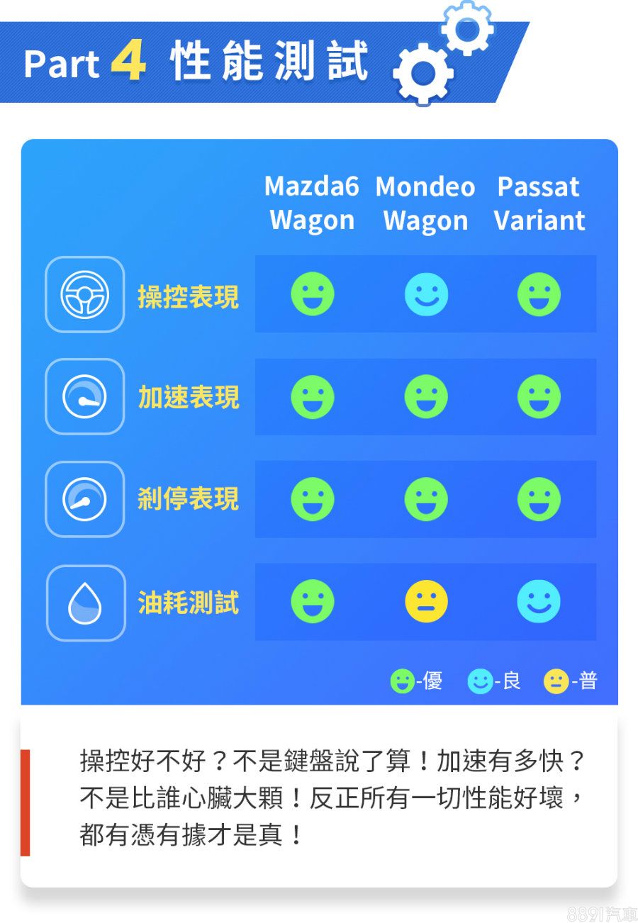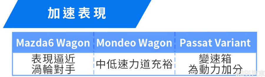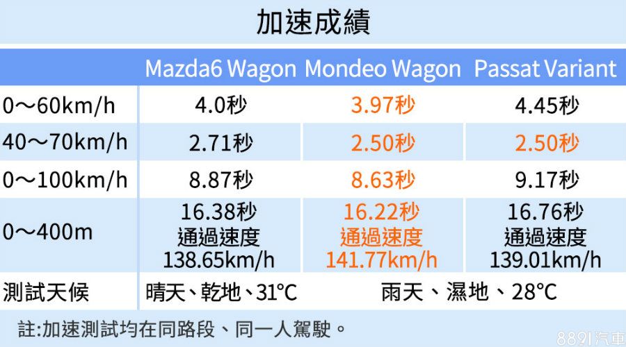 和煞停測試相同,Mazda6 Wagon在乾地進行,另兩車則是雨天測試,雖然雨天較為不利,但Mondeo Wagon加速表現完全勝出,不負擁有最大動力!Passat Variant則起步時,變速箱有保護機制,動力釋放略慢半拍,讓起步動作遲疑、無法一氣呵成而影響數據;至於Mazda6 Wagon的2.5升NA引擎和6速手自排組合成熟度高,全力衝刺的反應算是直接。