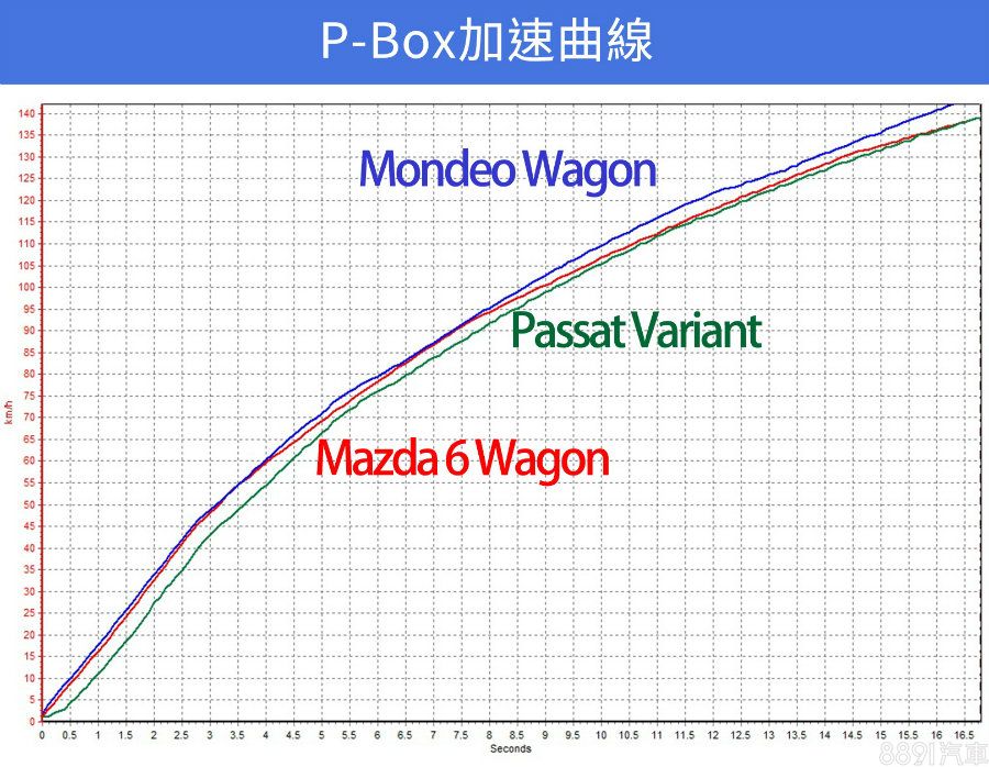 從P Box加速曲線來看,Passat Variant起步力道明顯最弱,如上文所說,是DSG變速箱保護機制所故,而Mondeo Wagon與Mazda6 Wagon在95km/h以前幾乎齊平,動力較小的Mazda6 Wagon有點厲害,100km/h之後,Mondeo Wagon才靠著240hp大馬力逐漸拉開距離。