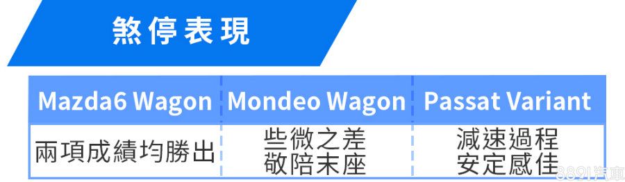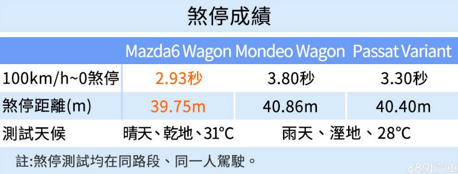 剎車測試最重要的就是需要多少減速距離,這回Mazda6 Wagon取得最佳成績,不過考量到天候因素,乾地總是比下雨天更有利,三車應該是不相上下的水準,彼此差距都非常接近,可說結果是平手。