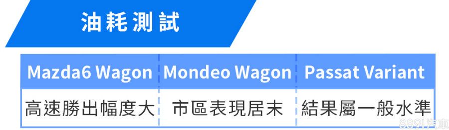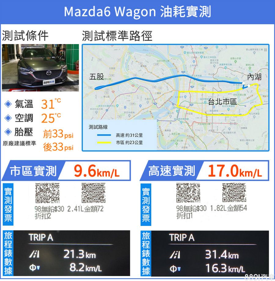 Mazda6 Wagon在油耗測試拔得頭籌,市區和高速路段均領先對手一些差距,若比對過去測試CX-5 2.5 4WD車型的歷史數據(市區:8.5km/L、高速:14.0km/L),相同動力、前驅配置的Mazda6 Wagon加上風阻更低的因素,實測數據非常合理。
