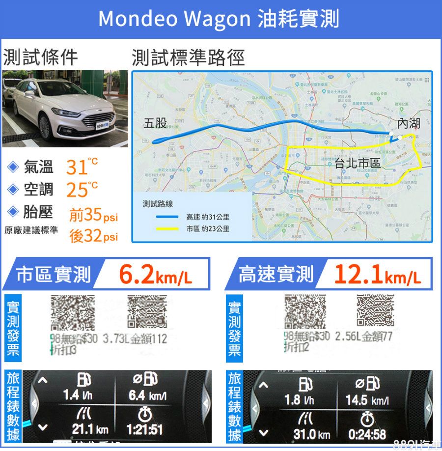 Mondeo Wagon實測數據與行車電腦之間的誤差值屬合理範圍,不論高速或市區的結果均不如同場對手,按以往經驗,福特車款的油耗表現在同級對比測試中,通常都處在末段班,這回結果並不令人意外。