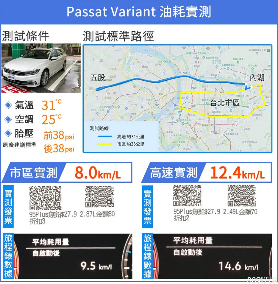Passat Variant高速實測數據和Mondeo Wagon在同個水平,但市區領先的幅度就比較多一些,和Mazda6 Wagon的9.6km/L差距更近,以當日壅塞的路況來說,表現還OK。