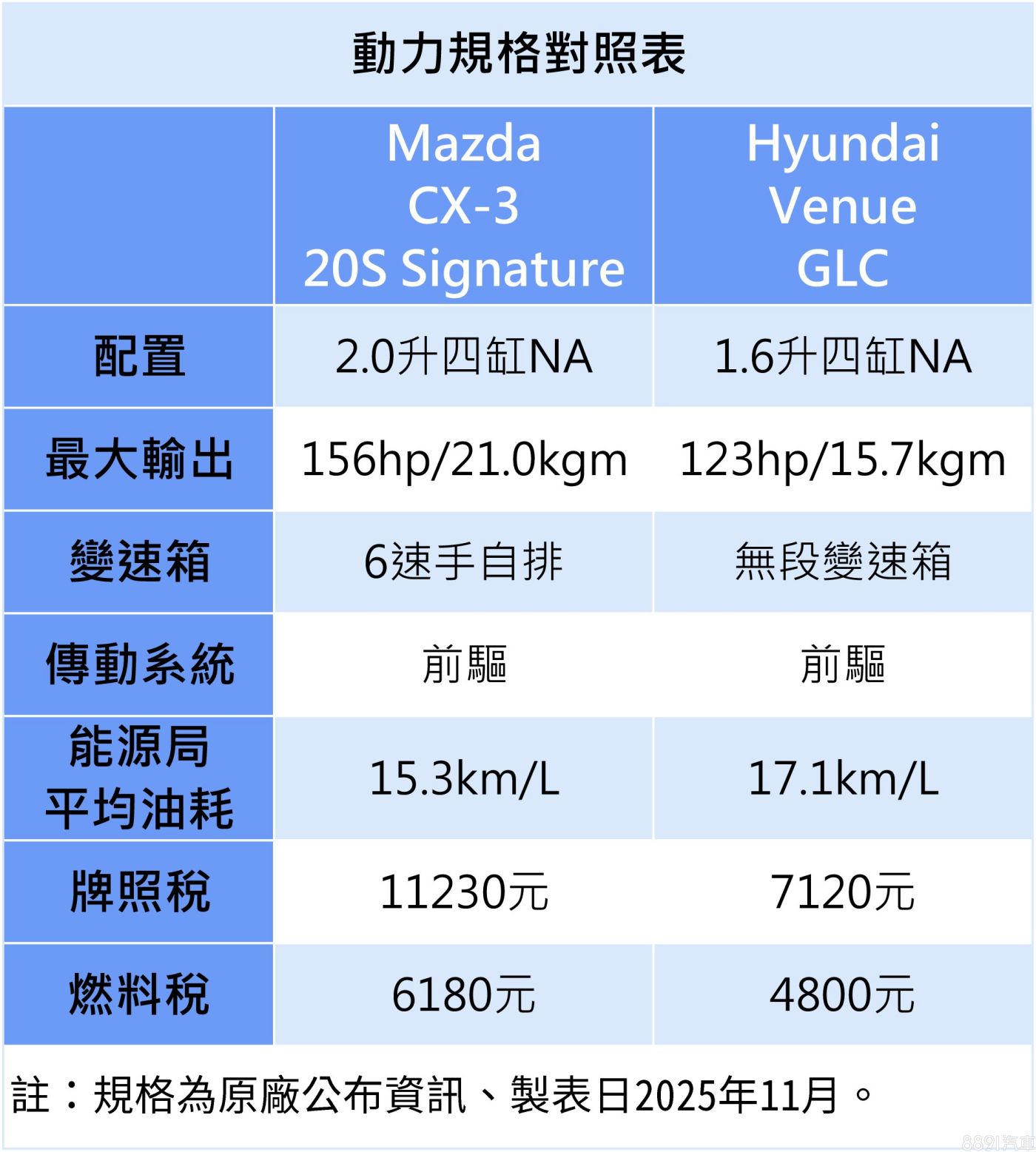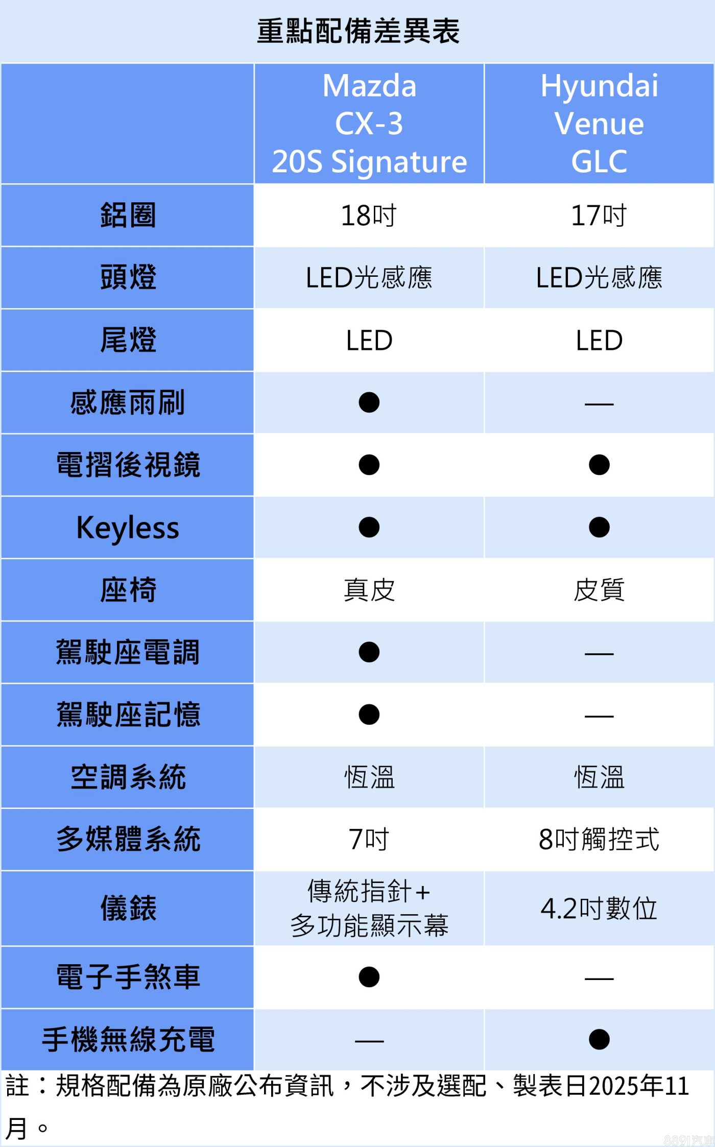 Mazda CX-3與Hyundai Venue GLC各有優勢,選擇重點會落在於你更重視的點:如果喜愛質感與便利配置、或希望有更充沛的動力,自然選擇CX-3;若重視駕駛輔助,希望每年稅金負擔不要太重,Venue GLC會更適合你。