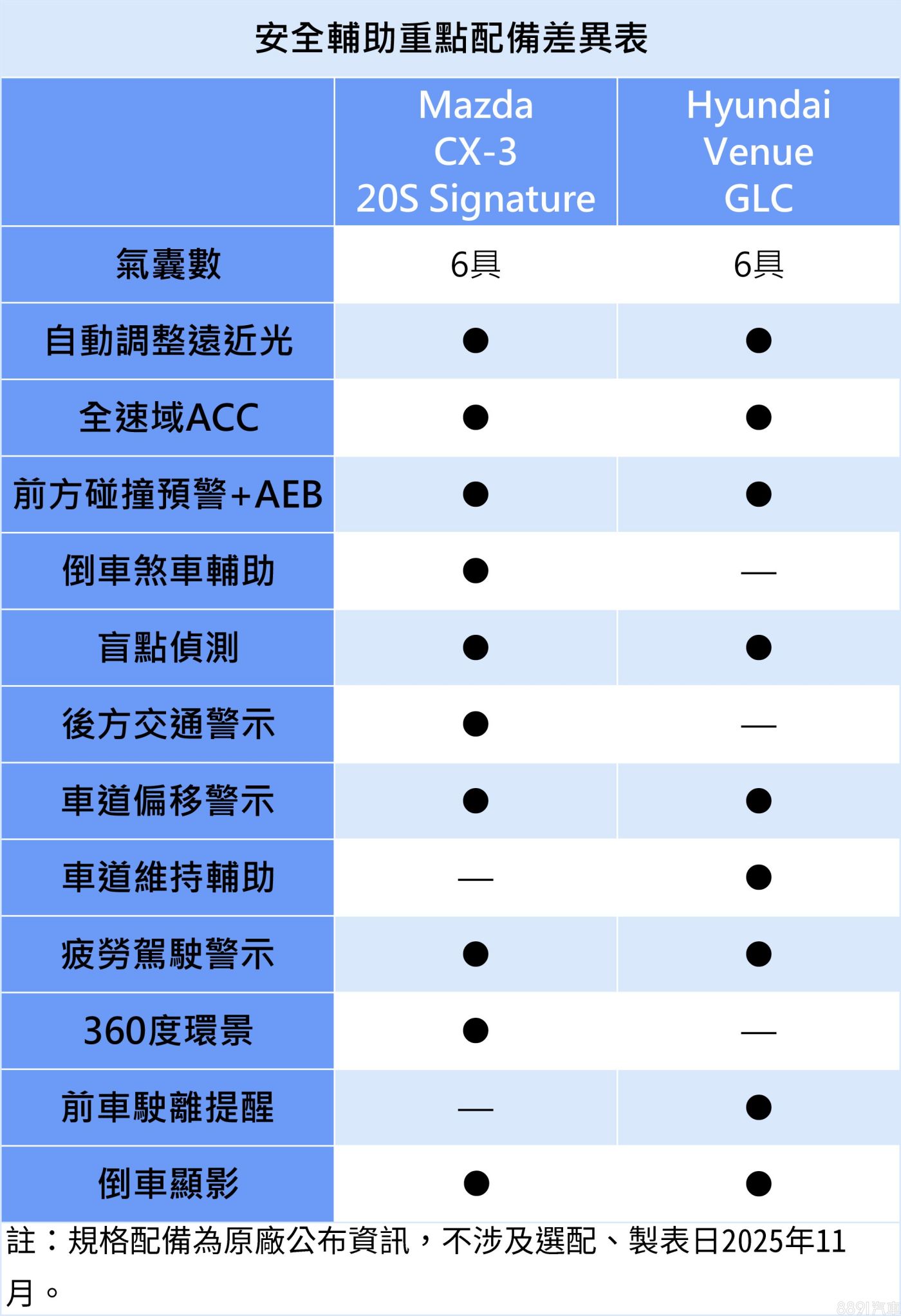 兩車在安全配備方面都頗具誠意,CX-3標配同級罕見的360度環景、後方交通警示,但硬傷是未能標配符合Level 2標準的駕駛輔助科技,這也讓Venue GLC有了決定性的優勢。
