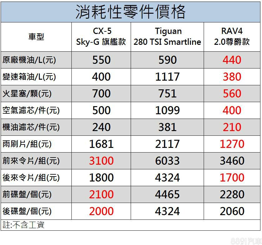 關於消耗零件部分,兩款日系車表現得相當出色,雖然RAV4在每個項目得分點較CX-5來的多,但差異僅在伯仲之間,CX-5緊追在後,不過另一個歐系對手Tiguan表現則差強人意些,每項價位都屬偏高,最高落差還來到一倍之多,使得對後續再車輛養護保養上,殺傷力一定不小。