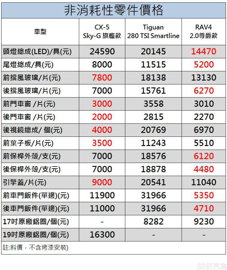 在非消耗器材上,RAV4與CX-5日系之爭,兩車得分項目上不分上下,不過RAV4綜合表現下來卻更有優勢,尤其在頭燈、前後車門鈑件上等多處,以低價位拔得頭籌,至於Tiguan若跟兩車相比,價位讓人乍舌不少,其中在後視鏡總成、與兩車門的鈑件都相當驚人。