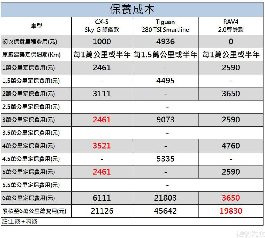 養育保養花費上,RAV4最出色為當中之冠,在此次評比中,唯一享有初次保養免費用的優惠,正因為如此,得以些微之差勝出CX-5,不過坦白說兩款在定保費用上,此價位已經進逼國產價,兩台車皆符合好養、好顧特質,而Tiguan雖然在定保里程上較其兩款來的晚些,原廠建議每1.5公里回廠一次即可,但前文提到消耗零件的弱勢,以及3萬與6萬公里時,各有不小的零件花費,總費用比起其他兩車,遺憾不少。