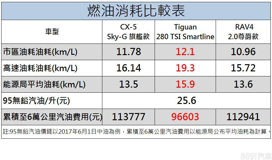從前面三大項來看,Tiguan顯然一路被壓著打,不過憑著1.4升小排氣量引擎科技優勢,燃油消耗上卻比其他兩對手更加亮眼,在能源局提供的平均、高速與市區油耗下,每項皆取得領先,以累積至6萬公里的總燃油花費為例,是唯一沒突破10萬元大關的車款,值得鼓掌。