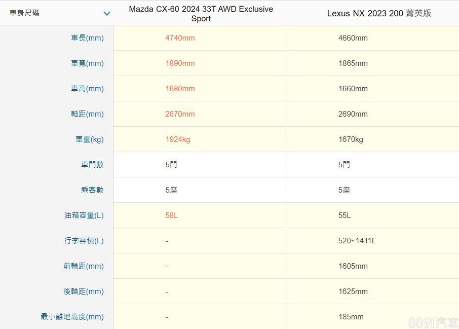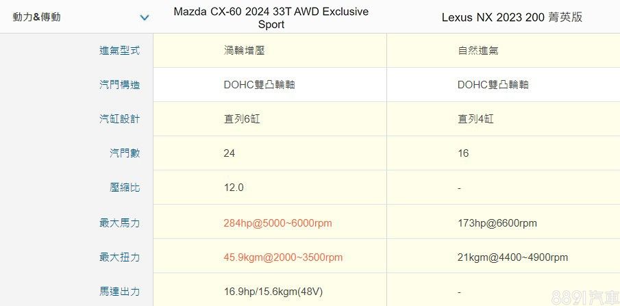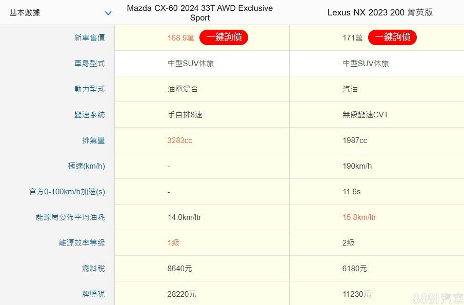 基本數據兩輛車可說是大相逕庭,CX-60頂規採用大排量引擎+8速手自排的組合,即便進一步導入48V輕油電系統,仍然在油耗表現上輸給採用2.0升引擎+CVT變速箱的NX 200,外加每年還要多付出約2萬元的稅金,天生就比對手更「高貴難養」。