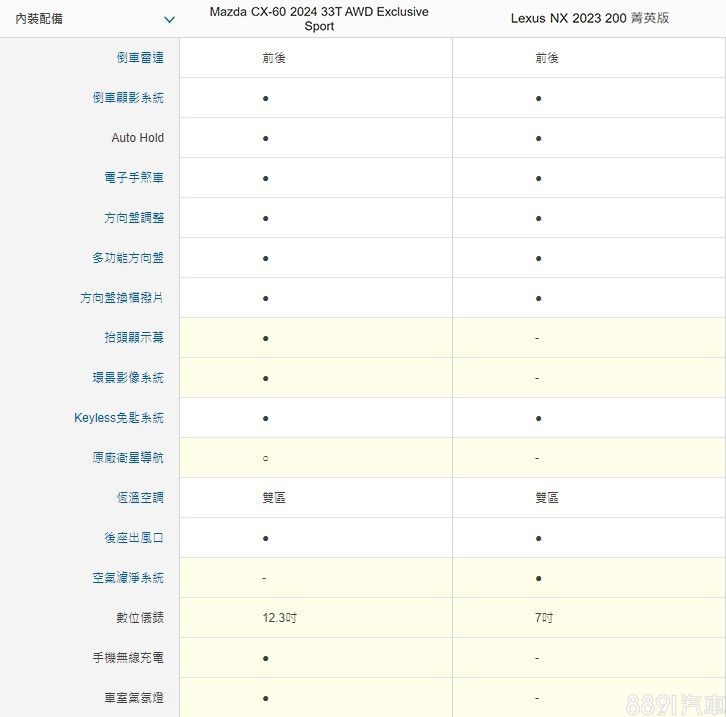 目前在8891一鍵詢價功能中,NX可提供到最高7萬的優惠,缺少的360環景系統也能一併補齊;CX-60則是因為剛上市,僅提供基本的交車配件禮,未來若有更多優惠,我們也會以最即時的速度上線。