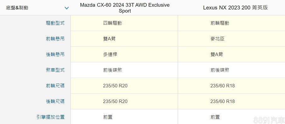 底盤結構部分,CX-60頂規採用縱置四驅、NX 200則是橫置前驅設定,而CX-60所搭載的鋁圈,不管在尺碼還是造型氣勢上都更勝NX 200;兩車配胎取向也有所不同,前者搭載的固特異EGP休旅胎,主打的是濕地性能與靜音舒適度,後者的普利司通Alenza 001則以舒適作為主要訴求。
