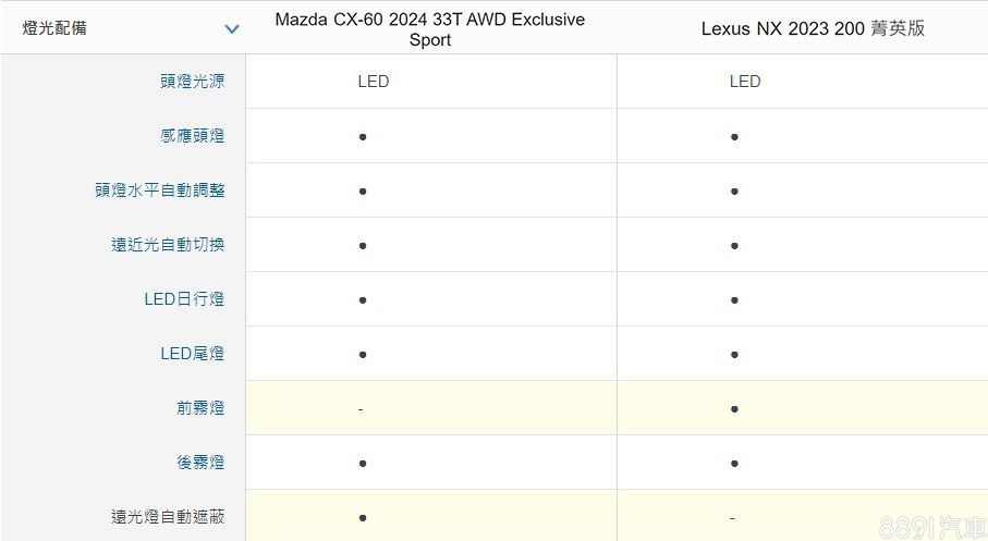 燈光與節能配備部分,兩者頭尾燈皆採LED光源,頭燈也都具備自動感應起閉與遠近光自適應功能,NX 200多了前霧燈、CX-60則是具備遠光燈主動遮蔽功能,車輛除了可透過光型變化來保護對向或前方駕駛者的視線外,還能強化路旁行人的視覺存在感,科技性相較對手進階許多。