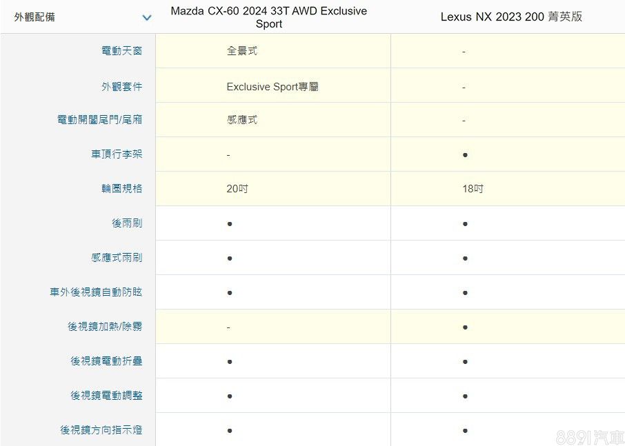 外觀配備部分,NX 200獨享車頂行李架及外後視鏡加熱除霧功能,但CX-60頂規卻比對手多了全景天窗、感應式電動尾門和運動化外觀套件,單就「配備堆疊感」來看,無疑是CX-60更勝一籌。