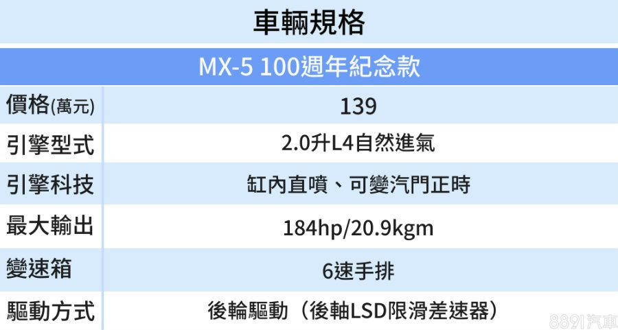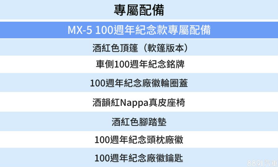 MX-5兩種版本的100週年紀念款都比常販車型多了5萬元,採用限時不限量的生產方式,外觀只能選擇躍雪白車色,內裝則以酒紅色為基調,動力、底盤和配備都不變,主要是多一份特殊性跟收藏價值。