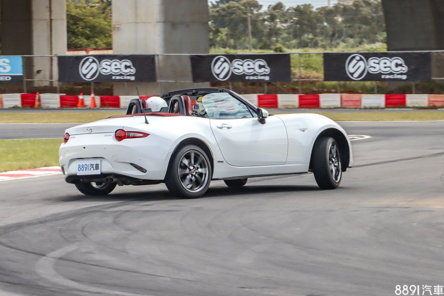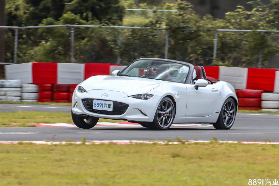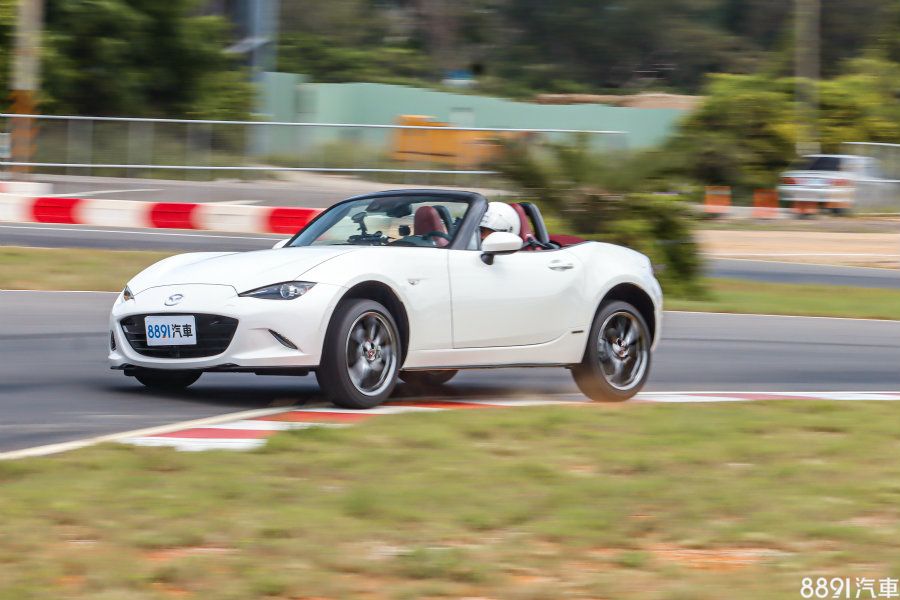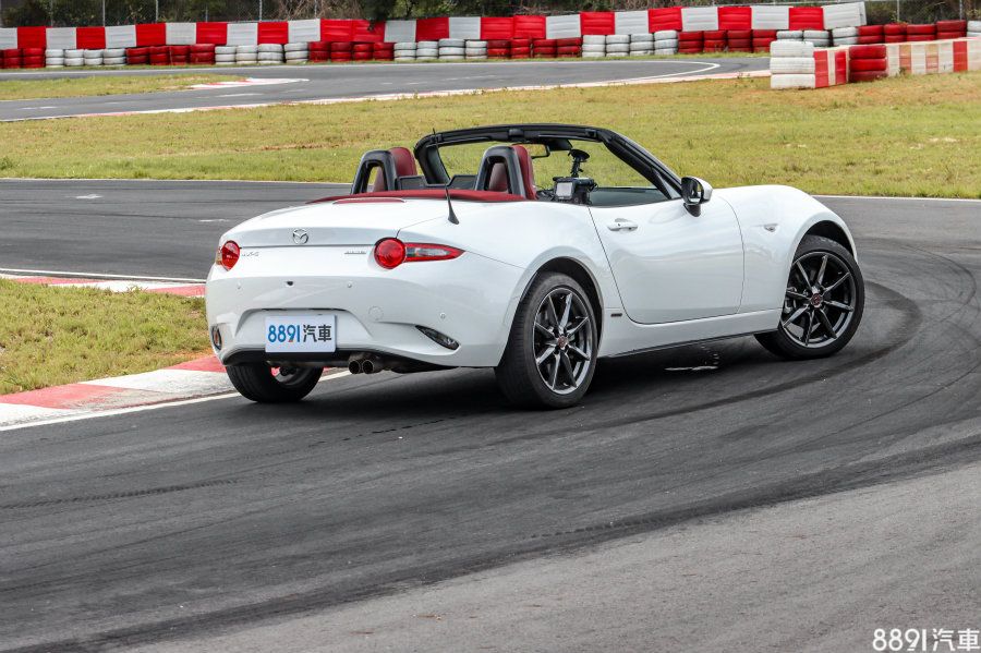 MX-5避震器阻尼不算軟,但過彎時車身側傾卻是明顯,但側傾到一定程度後穩定住,沒什麼不安搖晃感、安定性好,而較大的側傾,也有助於提醒駕駛人是否瀕臨極限,是降低駕駛難度的一種手法,畢竟是平民Fun Car,不能太有脾氣!由於車重輕盈,馬力也不兇猛,雖然205mm的S001跑胎不算寬,但實際抓地力卻頗為足夠,煞車規格也不高,同樣也能展現良好的制動效果,在全程2檔挑戰單圈之下,最佳紀錄為45.2秒,比起馬力大了快一百匹、配胎235mm米其林PS4S的Focus ST,只慢了0.3秒,顯見MX-5完全有以小搏大的能耐!