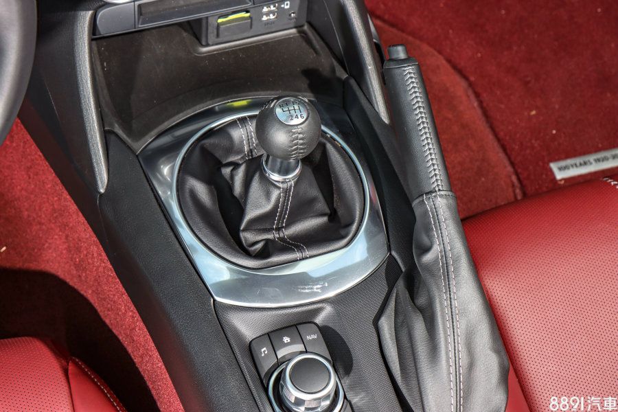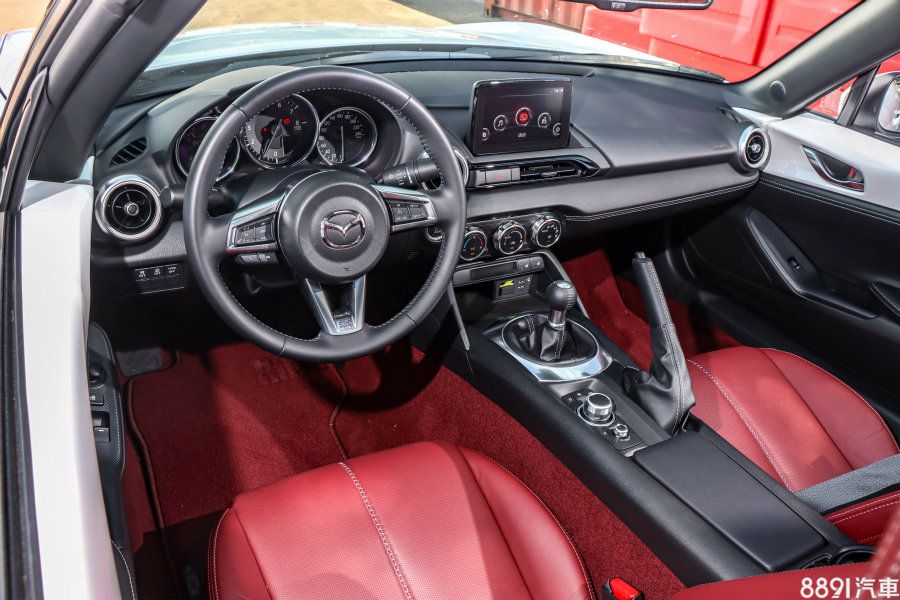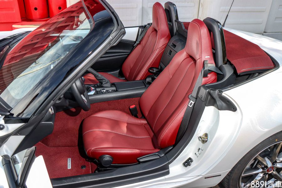 MX-5座艙配置單純,除了多媒體介面與空調控制,眼裡所見便完全與駕駛行為緊密連結,別說沒有豪華氣息,就連常見的內裝飾板也幾乎看不見,取而代之則是門板上緣、與車身同色的烤漆面板,將外觀視覺帶入座艙。紅色內裝則是100周年紀念款的專屬配置,腳踏墊與車內地毯也採用紅色鋪陳,與外觀白色車身搭配恰到好處。