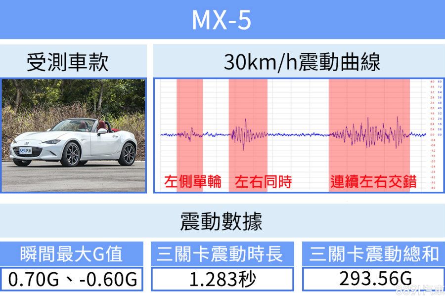 以60km/h通過測試路段,最大G值隨車速提高而顯著增加,但懸吊仍在短時間內恢復平穩,底盤貼地性相當出色,低速表現不甚理想的連續左右交錯關卡在60km/h變得平穩許多,再次凸顯MX-5懸吊作動俐落、車身快速回穩的特性。