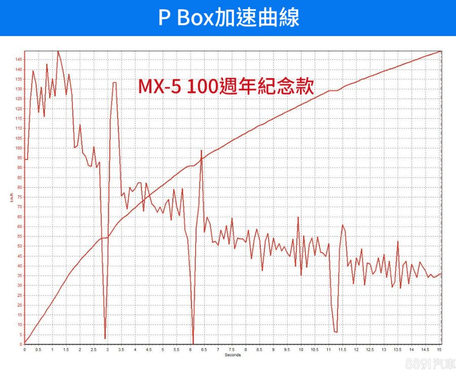 這是P Box的加速曲線,鋸齒狀的為G值,上坡狀攀升的為速度,從G值曲線可以看出,1檔起步算是順暢,G值沒有中途大幅掉落、起跑不順的情形,G值持續攀升到1檔末端,輪胎空轉情形也在合理範圍,而每次換檔時間大約0.3秒,換上檔位、離合器接合的瞬間,G值也都間向上攀升,代表離合器狀況良好,最終0~100km/h實測7.06秒,只要天氣稍微冷一點,一定可以跑進6秒俱樂部,而0~400m數據則是15.07秒、通過速度147.33km/h,以184hp馬力來看,有這樣表現真的挺快的!