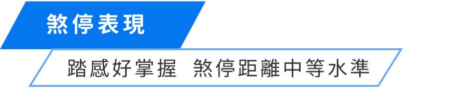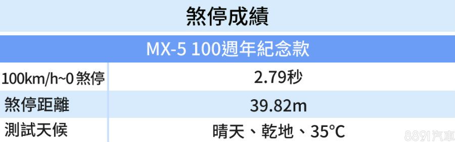 MX-5在一般行駛情況的煞車容易掌控、踏感明確,也由於車重只有1噸左右,煞車系統的負擔也不會太大,因此經過賽道激烈駕駛之後,也沒有太明顯的熱衰情況,而到了100km/h~0測試中,三趟成績都差不多,最佳表現為39.82m,如果以性能角度來看屬於一般水準,相信和僅205mm的胎寬有直接關聯。