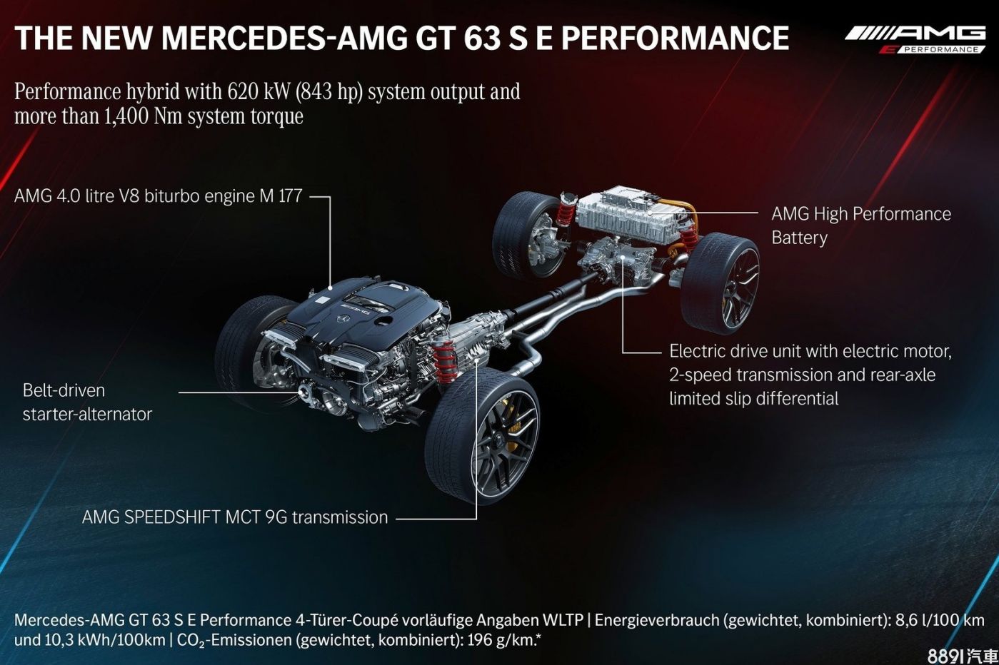 GT 63 S E Performance搭載代號M177的4.0升V8雙渦輪引擎搭配9速手自排變速箱,能輸出639hp/91.8kgm動力,光是這樣已非常強悍,但還不夠,另外在後軸加上具備2速變速箱的永磁同步馬達,可提供204hp/30.6kgm純電動力,最終讓綜效動力達到843hp/142.8kgm之譜,這數據光用看的就覺得很狂!