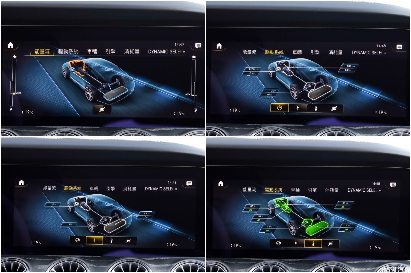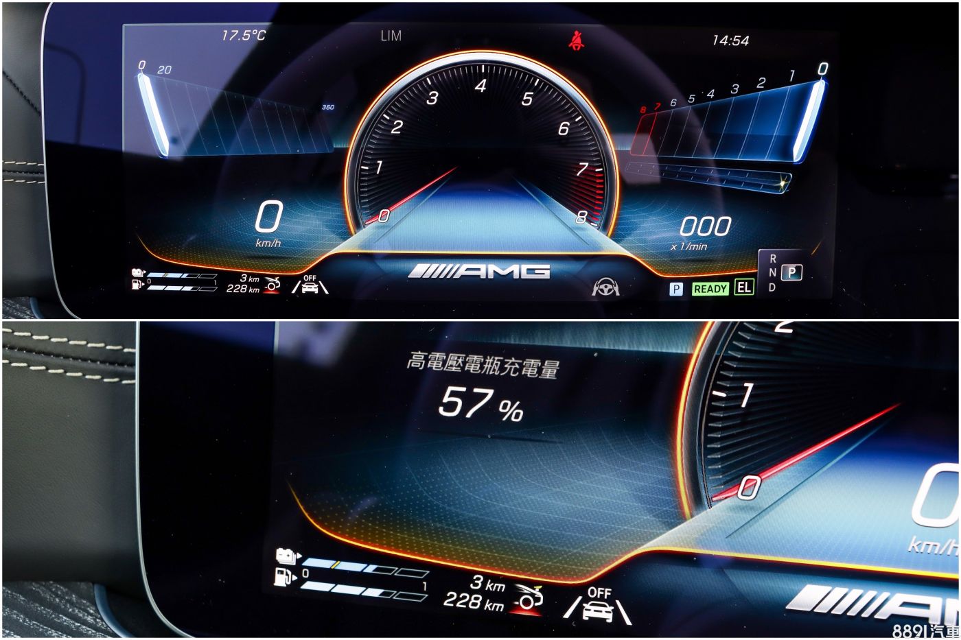 12.3吋儀錶設計有多種顯示風格,與既有AMG車款沒有太多不同,主要差異是多了鋰電池電量以及動能回收的顯示介面,也會預估目前電量可純電行駛的里程。