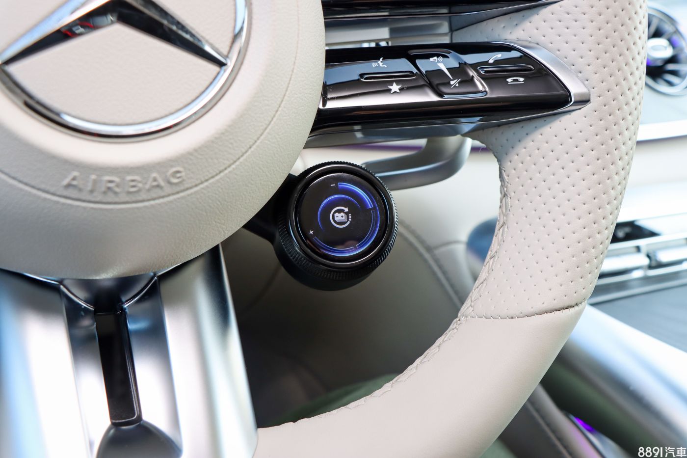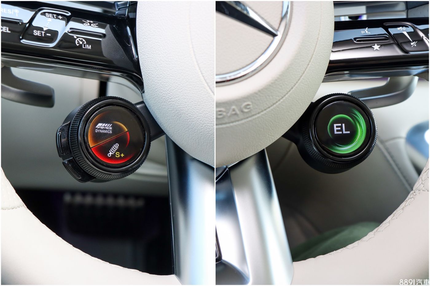 方向盤下方兩側有AMG專屬的快速調整旋鈕,左側可以控制懸吊阻尼、手排模式、排氣閥門、動態穩定系統等功能,右側則是負責切換駕駛模式以及動能回充的強弱。