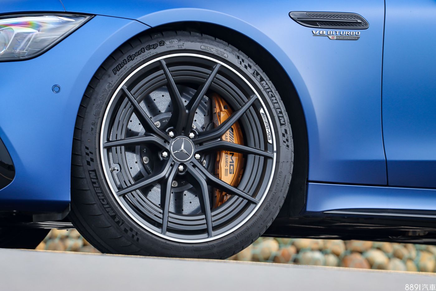 輪圈標配20吋規格,試駕車升級選配21吋款式(11.7萬),造型帥歸帥,但多了一圈黑色飾蓋似乎讓輪圈視覺效果縮小了一些 ; 輪胎同樣是選配,多花3.8萬可升級成試駕車上前275/35R21、後315/30R21的米其林Pilot Sport Cup 2,這套尺寸巨大的有紋熱熔胎放在GT 63 S E Performance上只是剛好,另外AMG陶瓷複合煞車系統則是標配,金色的卡鉗就是地位象徵。
