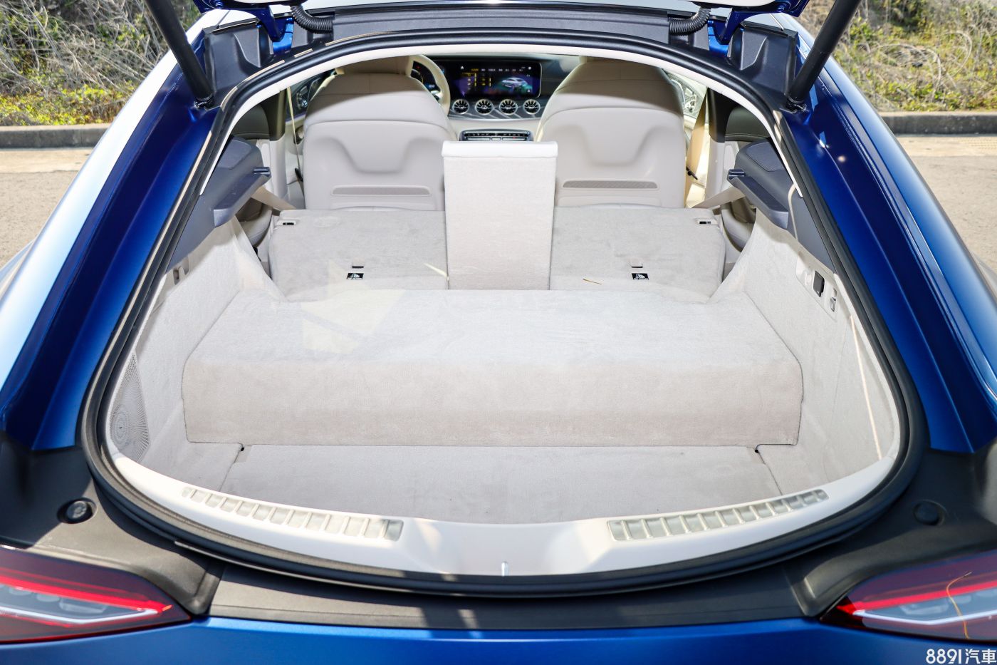 選配獨立後座套件後,後座中央椅背就無法傾倒,會影響擺放機能,也可以看到行李廂底部有明顯隆起,那是因為GT 63 S E Performance多了鋰電池,行李廂標準容積從GT 43的456L縮減至335L,但我想這不是這車買家會在意的缺點,要全家旅行或是去賣場採買,開家裡另一台GLS就好。