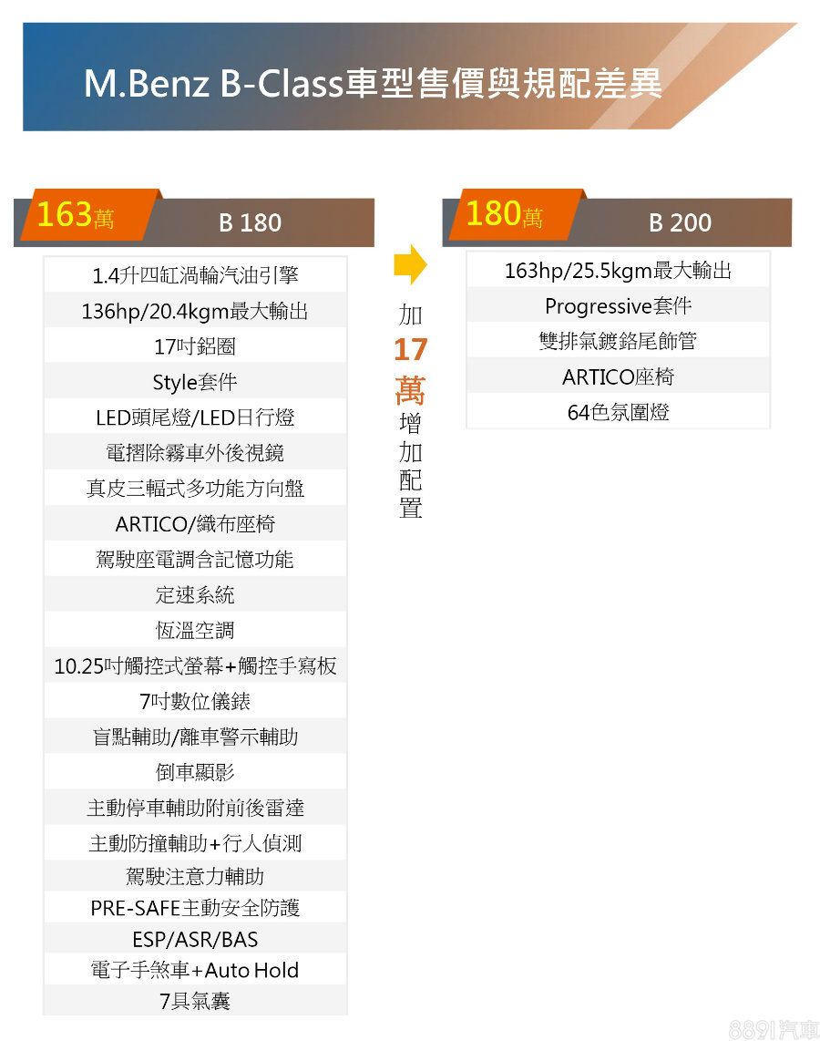 目前台灣導入的車款有B180以及B200兩款車型,兩者使用相同的引擎,但在輸出調整上有所差異,配備方面差異不大,端看消費者對於動力方面的需求選擇不同的車款。