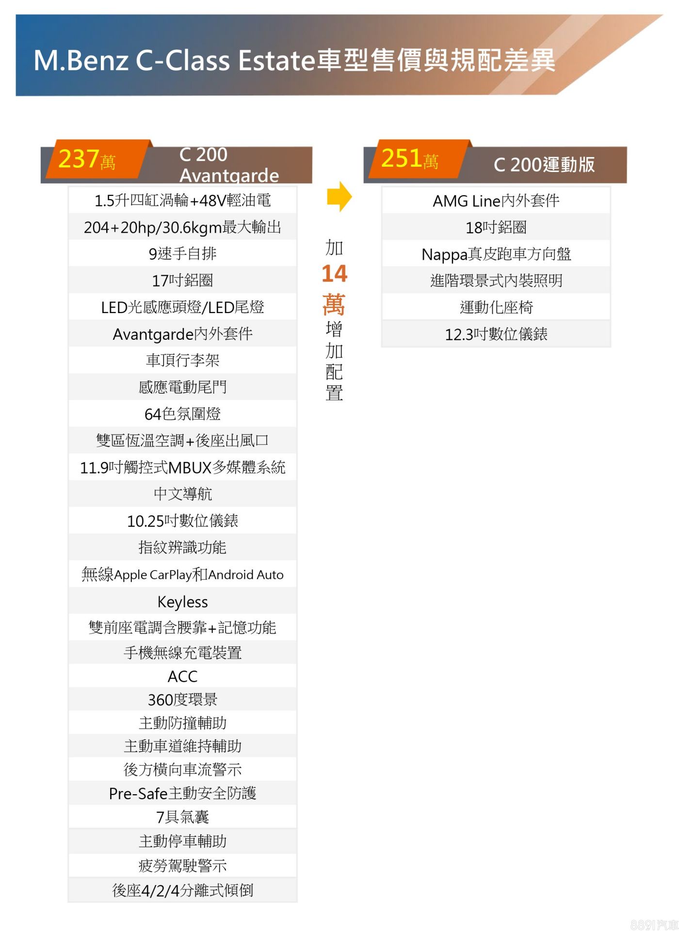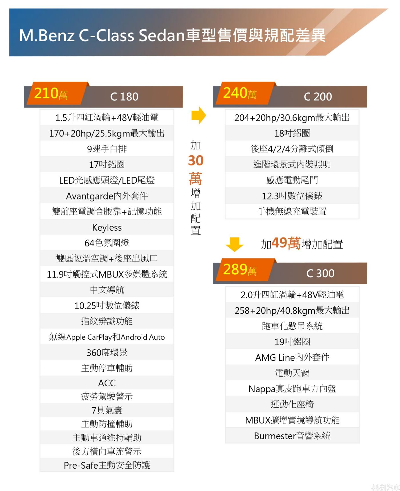 有「小S」之稱的C-Class,大改款首波在台導入Sedan房車和Estate旅行車版本,前者提供C 180、C 200、C 300三車型;後者有C 200 Avantgard、C 200運動版兩選項。