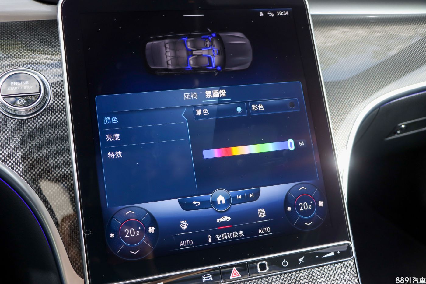 環景內裝照明除了基本64色選擇外,也提供主題色彩供選擇,雖然人家都說是「氛圍燈」了,就是讓你在昏暗的空間下展現氣氛的東西,但我還是覺得白天看不太出來不夠高調,內心將其歸類於噱頭配備。