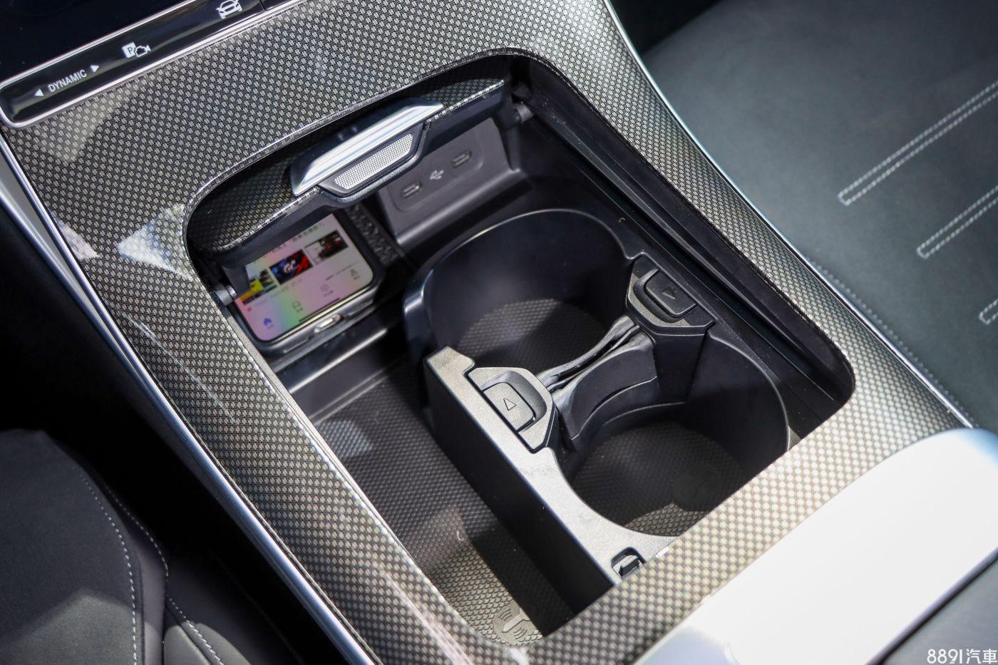 中央鞍座隔板採用伸縮滑移設計,內部有手機無線充電裝置(C 200運動版)與雙置杯架等規劃,這裡又得嘴一下,想把手機放置在無線充電板上實在憋扭,不太好形容,大概就是得把手機往前「一直ㄊㄨˋ一直ㄊㄨˋ」才Ok這樣。