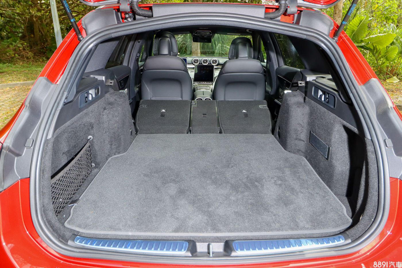 標配有方便的後座椅背一鍵傾倒按鈕,感應電動尾門為C 200運動版才有,試駕車另加選了多條固定繩索、裝載軌道、行李固定柵欄、安全網等配置,如果你有收納強迫症,這些會是你的好幫手,我個人是沒有、能放就好。
