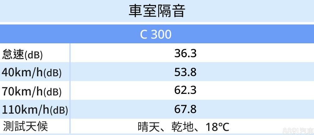 C 300座艙隔音優異,怠速測得36.3dB參考過往數據名列前茅,然而隨著車速逐漸提升,來自輪拱的輪胎滾動聲卻跟著越發鮮明,雖然低頻聲響不致於破壞行車質感,在一片寧靜的車室中卻很難讓人不在意。