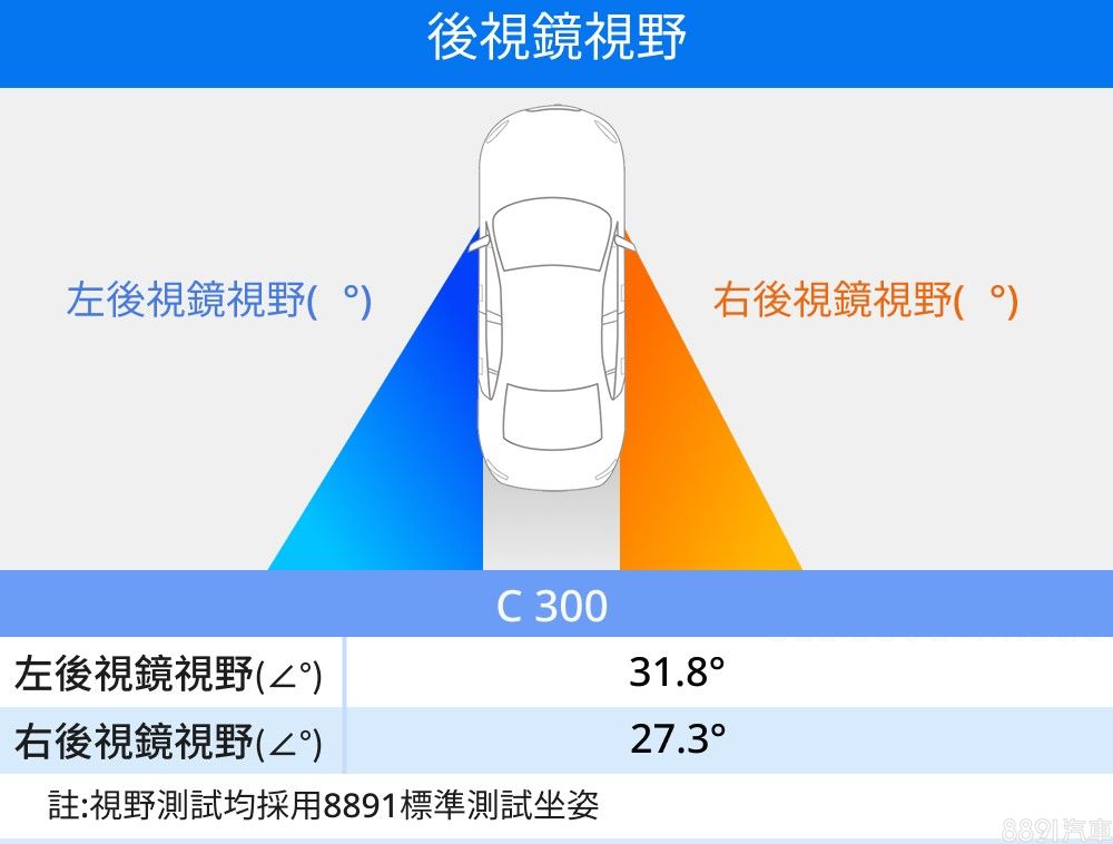 環視C-Class座艙並沒有明顯的視覺死角,A、B、C柱設置角度都在合理範圍,實測發現C柱死角比起同級中型房車略小一些,造就僅23.4%的視覺盲區,表現不錯。