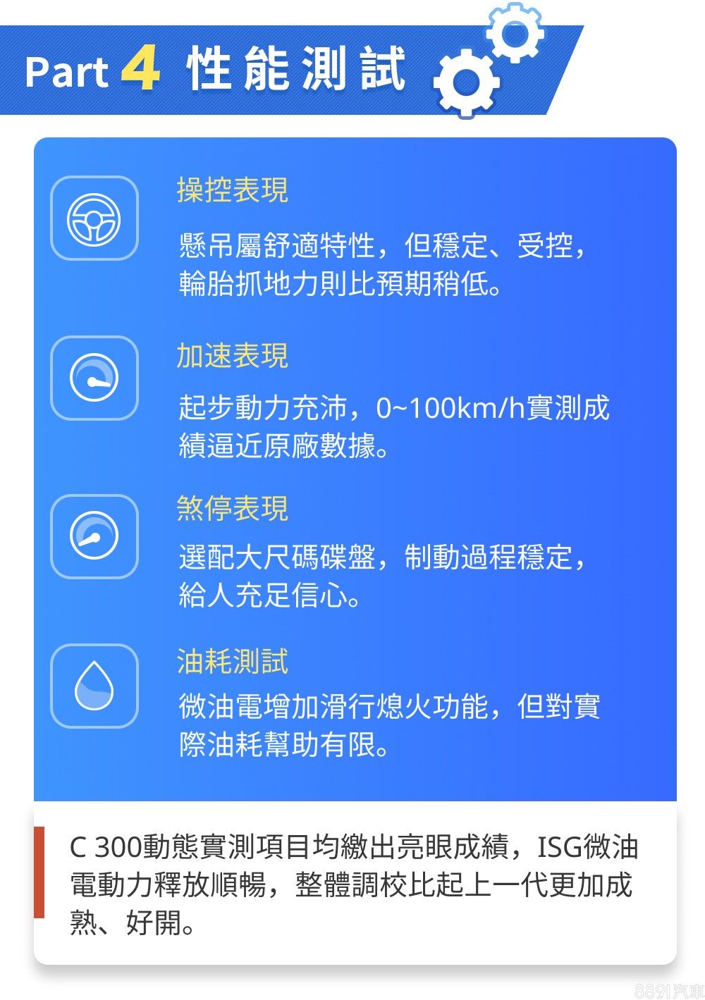 經過完整實測,C 300的各項數據都有水準以上的表現,慢慢開能享受空間大、隔音佳、底盤吸震好這些「豪華感」,要激烈操駕也能提供又快又安穩的動態回饋,44.8秒的優秀賽道成績就是最好證明,更不用說那些用眼睛就能看到的新潮科技配備,這些收放自如又全面的表現,背後是幾十年來累積的深厚造車工藝,整體確實難以挑剔。唯一可惜的是這次因為原廠試乘車時間喬不攏,無法與頭號對手BMW 3 Series來一場正面對決,未來我們也會持續安排規劃,想必會相當精彩。