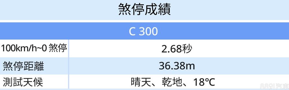 這輛C 300選配加大打孔前碟盤,前碟盤尺寸從330mm放大至342mm(後碟維持300mm),煞車卡鉗也因應換上活塞、卡鉗本體略大的對四活塞卡鉗,卡鉗表面甚至有著Mercedes-Benz字樣,選配價1.4萬元換來視覺、性能同步升級,相當划算。實測100km/h煞停距離36.38m,且制動過程車身相當穩定,整體表現令人滿意。