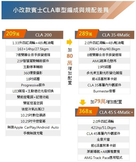 對比改款前各版本售價有6~8萬不等漲幅,主要是多了48V輕油電系統、MBUX 2.0車載系統之外,入門CLA 200頭燈多出遠近光自動切換功能,手機Apple CarPlay/Android Auto改成無線連接,並且將360環景攝影納入標配,配備豐富度合乎售價漲幅。