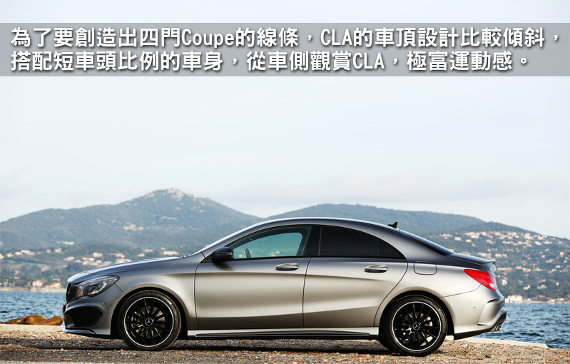 與 A-Class車系相同的底盤,所以B柱之前的造形設計幾乎與A-Class相仿,但為了要創造出四門Coupe的線條,所以CLA的車頂設計比較傾斜, 這點與它的老大哥CLS如出一徹,0.22Cd低風阻係數更勝它的老大哥CLS,搭配短車頭比例的車身,從車側觀賞CLA,極富運動感。