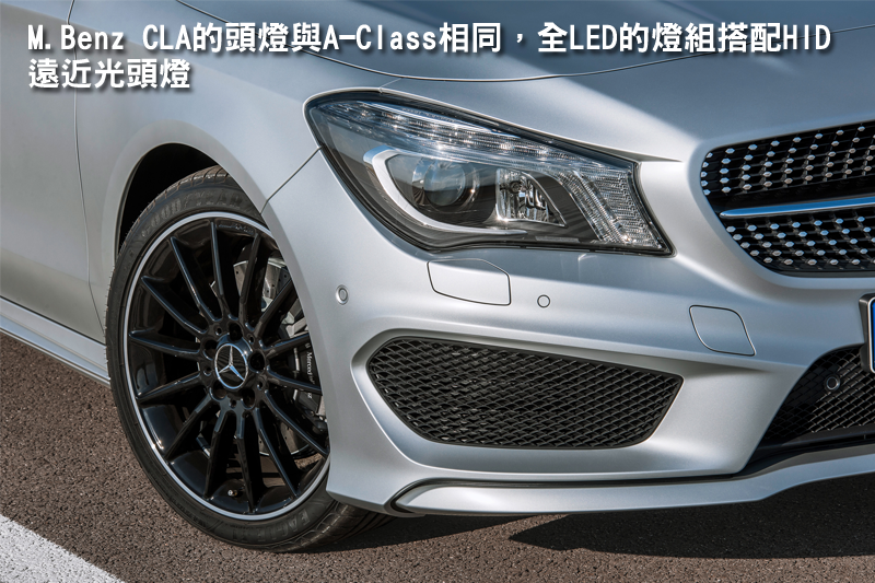 M.Benz CLA的頭燈與A-Class相同,全LED的燈組搭配HID遠近光頭燈,比較大的差異是在前、後保桿,Sport車型具有非常誇張的進氣口造型,當然原 廠也在現場發表了Edition 1車型,更運動化的極致表現,相信未來將會是追求時尚與速度車迷的首選,不過並未在此次試駕車單中!