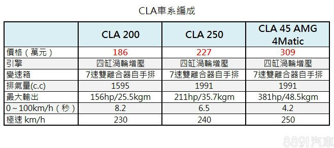 和其他MFA家族成員相同,CLA全車系均搭配7速雙離合器自手排變速箱,除了性能版本AMG45之外,統一採前驅設定,而此回主角CLA250的0~100km/h加速官方數據為6.5秒,能源局公布平均油耗則是14.3km/L,屬一級能效。