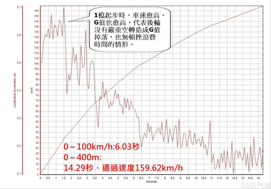 此車0~100km/h原廠成績為6秒,我們實際跑出相同的6.03秒,全力起步時,275mm的Good Yera F1跑胎仍會明顯空轉,須適度收點油門,才不會嚴重空轉造成浪費時間,以299hp/40.8kgm動力加上馬達14hp來說,0~100km/h能將1775kg的CLS350推至6秒,動力表現是高水準演出!