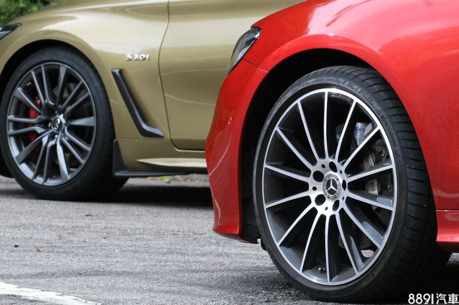 這部E400 Coupe選配20吋的多幅式鋁圈,標配則為19吋的五幅造型,看來更飽滿沒錯,但懸吊高度在低一些會更有氣勢,至於Q60S 3.0t Red Sport則仍是標準配置的19吋規格,同場對比的視覺張力稍低,但內部的鮮紅塗裝煞車卡鉗則為運動感扳回一城。