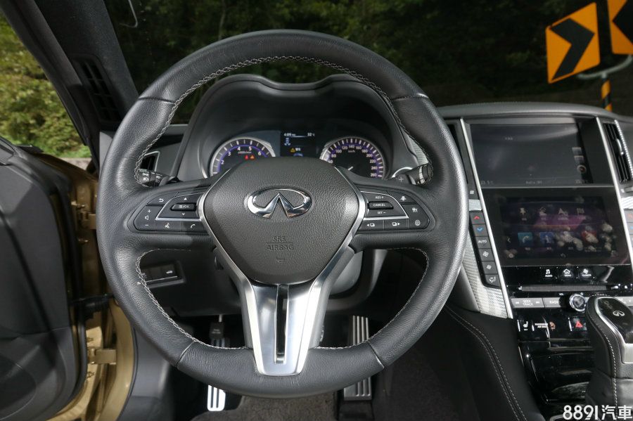 方向盤的握感出色,止滑度與握柄的粗細設定,能符合此車運動性,只不過上頭的多功能按鍵,感覺和Nissan車款的共通性高,自身高級品牌應該要有專屬設計才對。