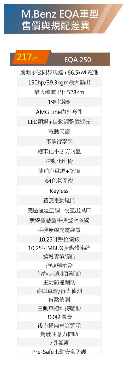 小改款EQA維持單一車型,售價不變,開價同為217萬,除了內外整形、導入MBUX 2.0系統之外,配備面可說是大升級,包含AMG Line套件、全景電動天窗、360環景、自動停車輔助、HUD抬頭顯示器、Burmester音響等過往需要選配的項目,現在都直接標配給你,參考先前選配價,上述項目加總約36萬,等於選好選滿就破250萬,雖然賓士不像Tesla那樣打價格戰,但「變相的降價」消費者絕對也樂見!