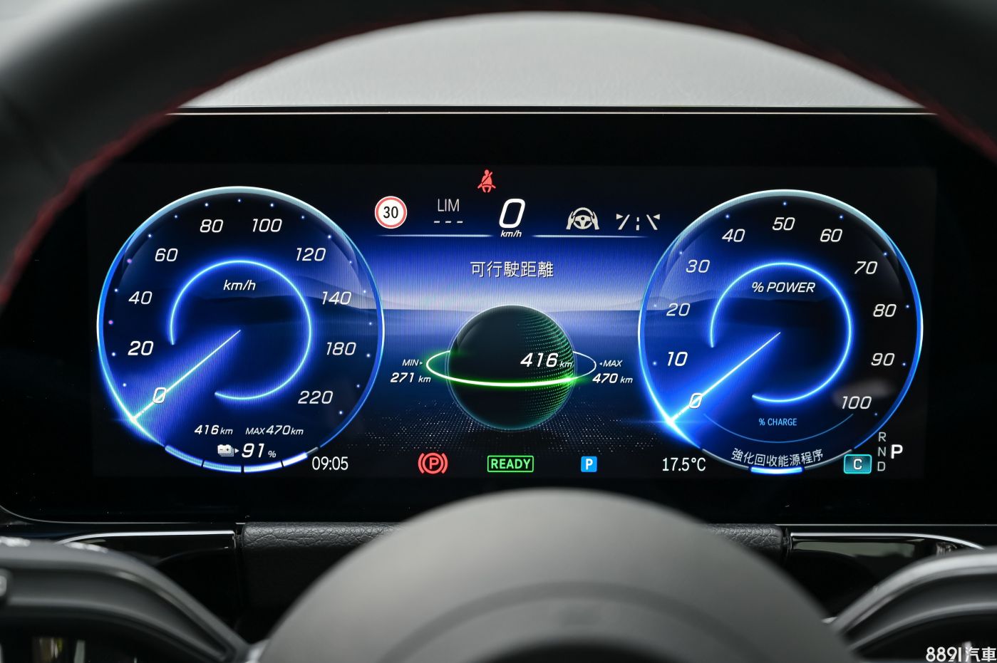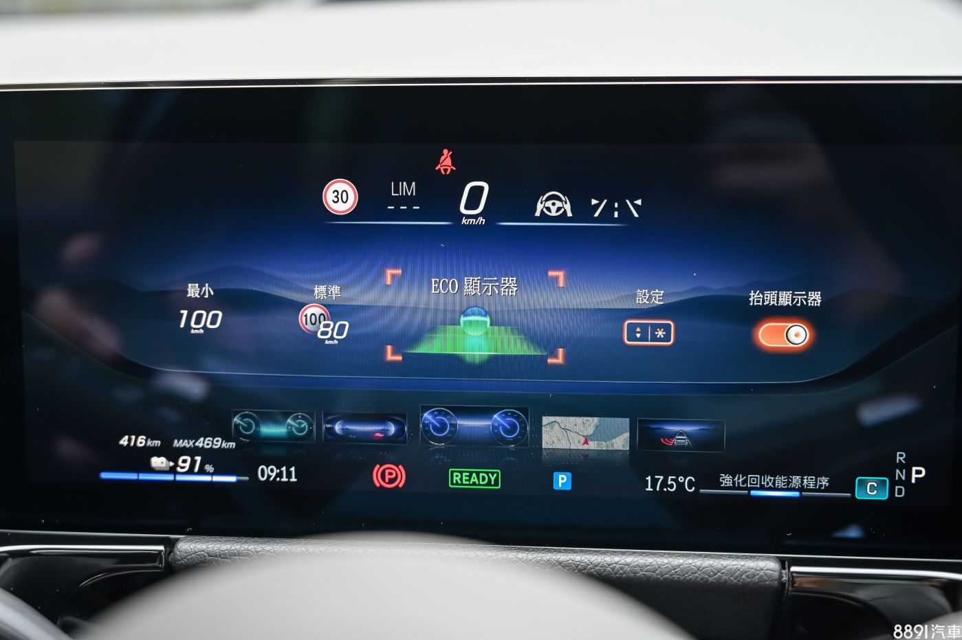 數位儀錶雖然同為10.25吋,但因為導入MBUX 2.0系統,顯示介面做了更新,提供有經典、簡潔、運動以及全地圖等四種顯示風格,畫質清晰、介面切換也快速,試駕下來,個人偏好的是「經典」的傳統雙環式樣,儀錶左側可看時速、續航力,右側顯示馬達輸出、動能回收等相關內容,中央則可自由選擇車況、駕駛輔助、地圖等等,能一次掌握多樣化的行車資訊。