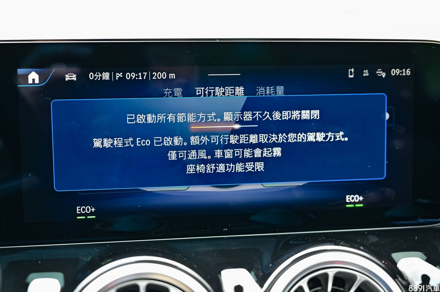 其實小改款EQA還有提供「Eco+」,只不過這模式無法從中船上的Dynamic按鍵做選擇,而是必須從中控螢幕中才能啟用,此時駕駛模式除了會自動切為Eco外,空調轉為送風,同時中控螢幕也會暫時關閉,等需要用時再輕觸喚醒即可,目的是為了節省電力,以增加續航里程。