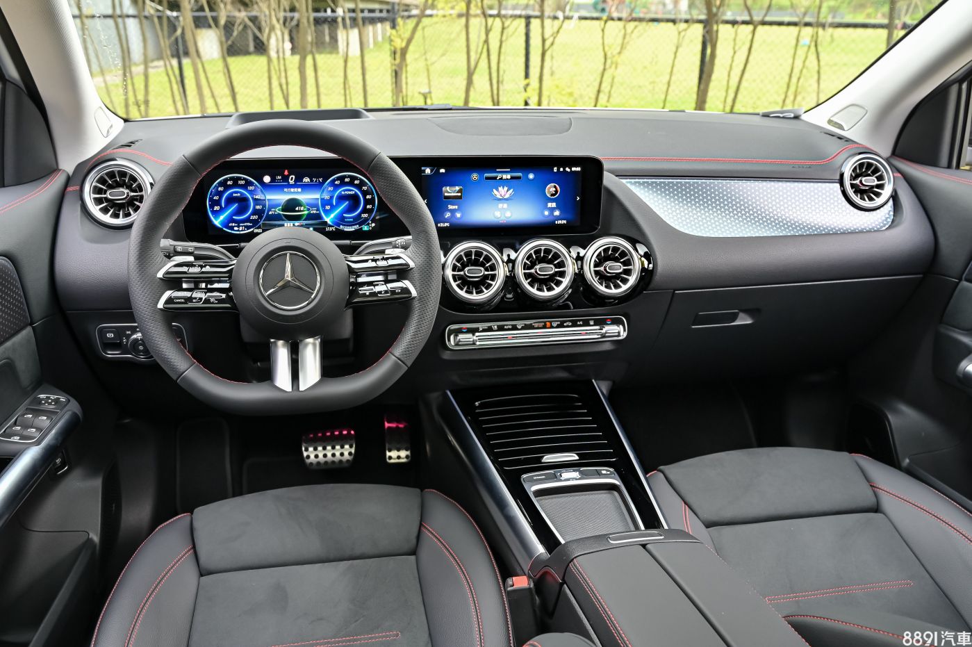 座艙依舊是熟悉的布局,標配10.25吋數位儀錶+10.25吋中控螢幕,加上渦輪狀的出風口、副駕駛座前方的三芒星發光飾板、64色環艙氣氛燈等配置,以及滿布中控台、扶手、車門板等處的紅色縫線,無論質感或細節的處理依舊很到位。